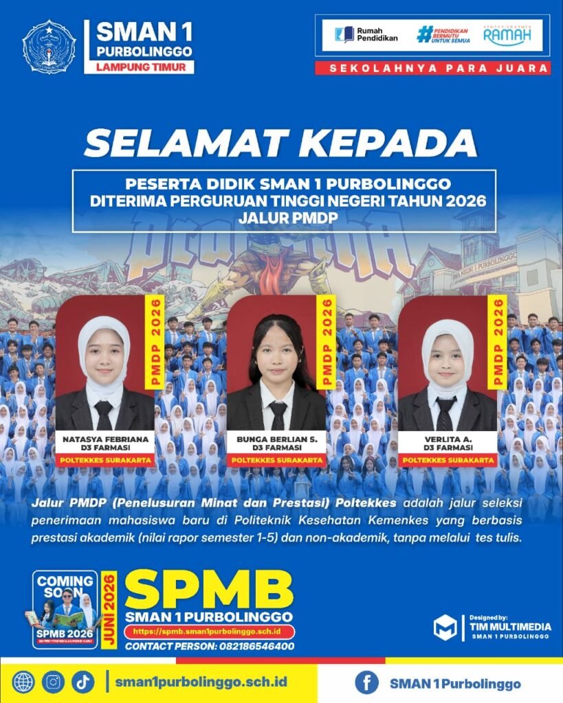 Jangan lupa, bagi calon peserta didik baru, SPMB SMAN 1 Purbolinggo Tahun 2026 akan segera hadir pada bulan Juni mendatang. Pastikan kalian menjadi bagian dari generasi juara berikutnya!